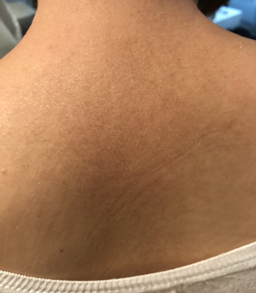 This photo was taken in 2019. After I started skin fasting and stopped using shampoo, the itchy scalp had subsided. However, as you can see, my back, which I had been scratching so much, had developed post-inflammatory hyperpigmentation and was completely dark.