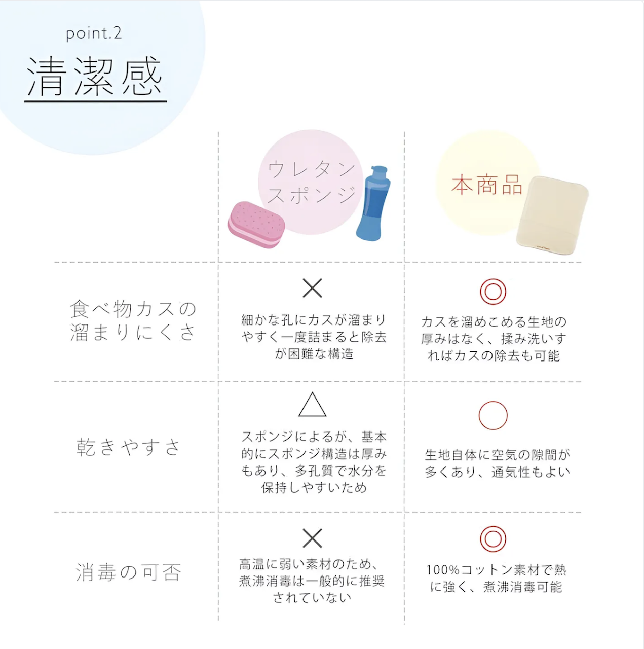 This product is less likely to trap food debris than a urethane sponge, and because it is made from 100% cotton, it can be sterilized by boiling, making it hygienic.