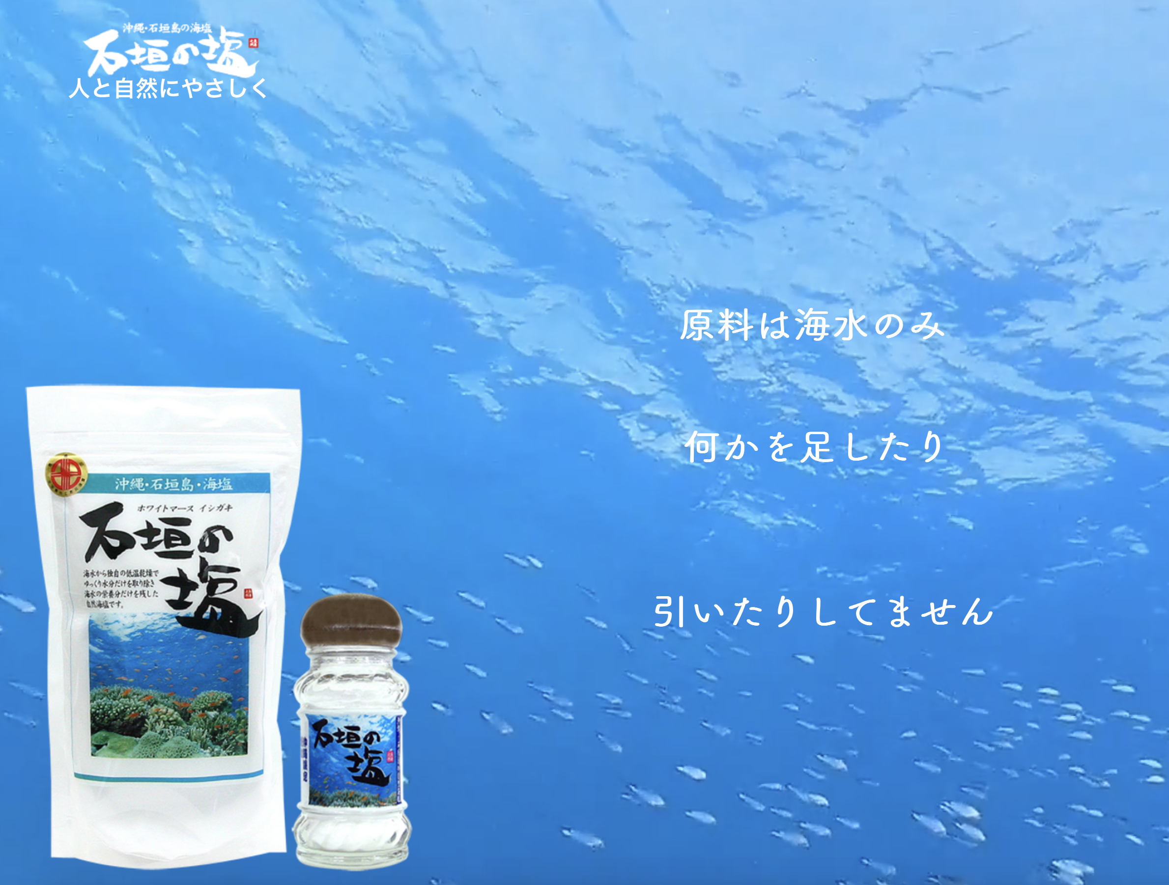 Ishigaki Salt is a delicious salt made from 100% seawater from Nagura Bay in the Yaeyama Islands, the southernmost part of Japan where coral reefs grow. It is brewed by the local islanders and is kind to both people and nature.